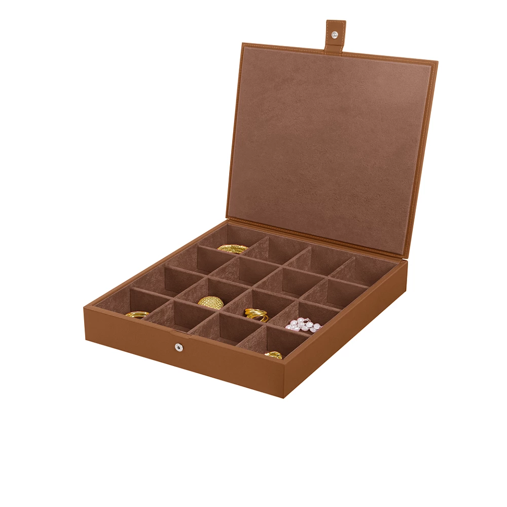 Leather Jewellery Box – 16 Compartments Tan  - Smooth Leather